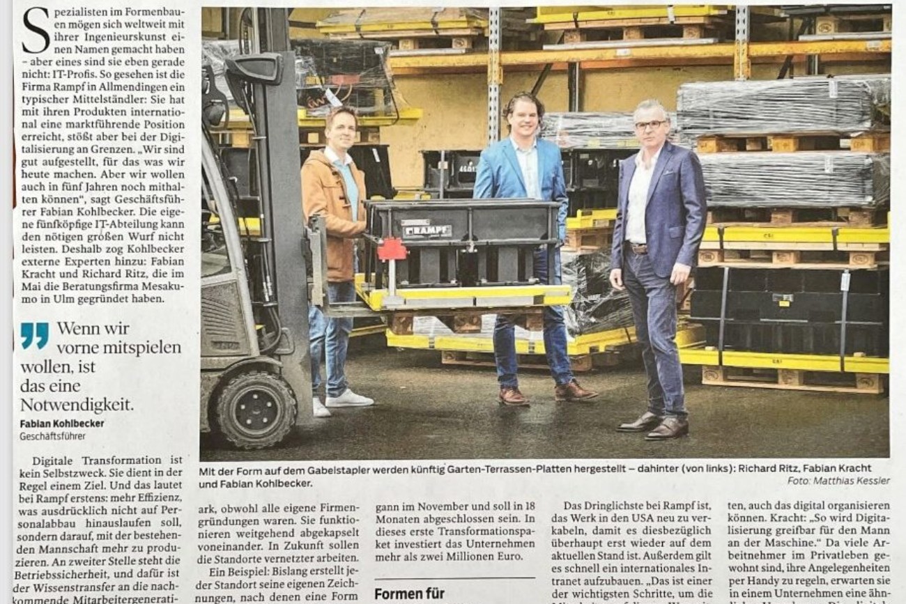 Toller Start nach der Gründung: Im Sommer 2021 haben wir über 8 Wochen mit der Geschäftsleitung von RAMPF FORMEN GmbH (Fabian Kohlbecker, Martina Wanner, Carmen Stockburger) ein Zielbild für Digitalisierung und IT-Modernisierung beim mittelständischen Formenhersteller mit ca. 500 Mitarbeiter:innen erarbeitet und in ein Umsetzungsprogramm überführt. Ausgangspunkt dafür waren das Geschäftsmodell und die Unternehmensstrategie von RAMPF. Basierend darauf haben wir gemeinsam die Ziele der Digitalen Transformation festgelegt und ca. 30 spezifische Initiativen abgeleitet: Dazu gehören typische Modernisierungen in IT-Betrieb und -Service, aber genauso Prozessoptimierungen sowie Initiativen zur stärkeren digitalen Interaktion mit Kunden und Mitarbeiter:innen. Alle Initiativen wurden priorisiert, bzgl. Kosten und Nutzen bewertet und in eine sinnvolle Reihenfolge (Roadmap) gebracht.